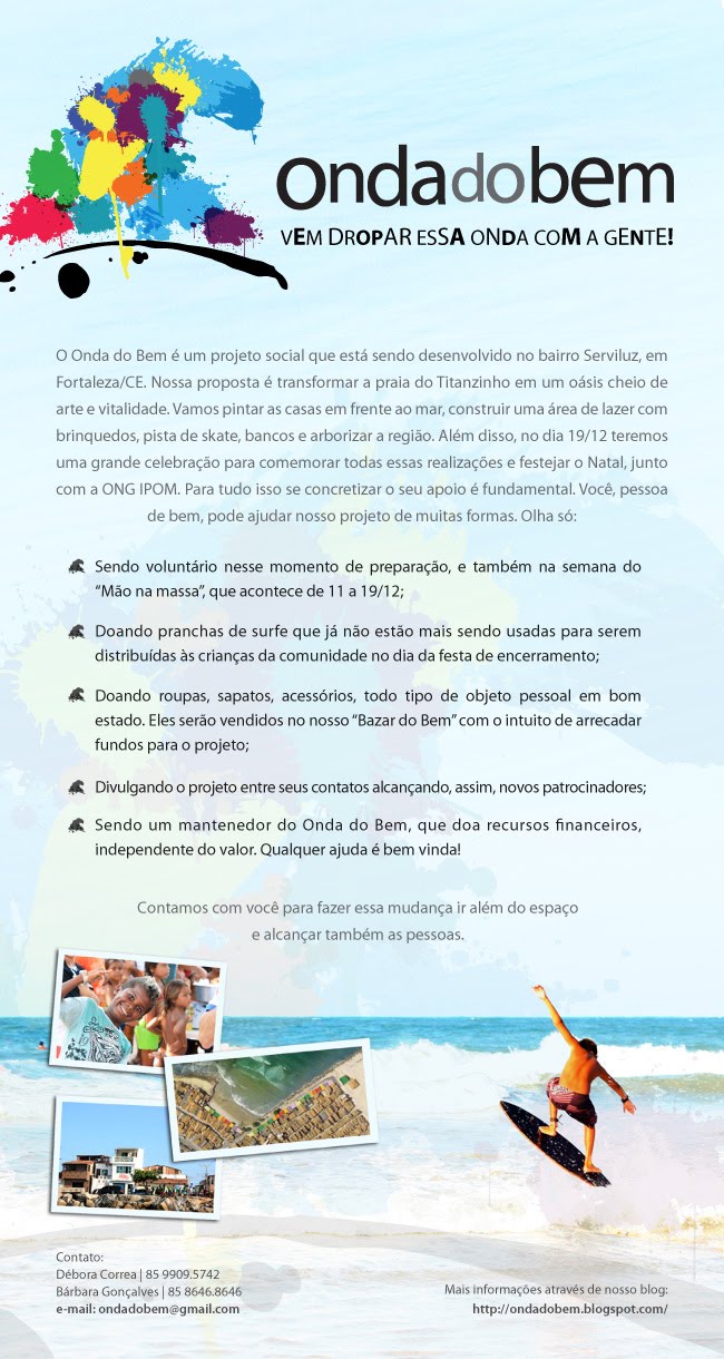 O Onda do Bem é um projeto social que busca, através da arte, dar cor, vitalidade e dignidade a locais onde o surfe é o coração da comunidade. A ideia é criar laços, contagiar os espaços e, o mais importante, fazer a transformação acontecer não só na comunidade, mas junto com ela.